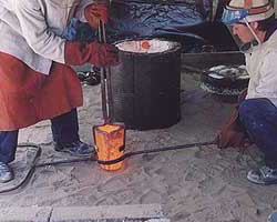 from the hot pit with tongs, another prepares the sand and, hand in glove,
