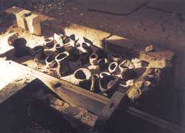 There is one glowing charcoal pit laden with clay moulds and one smooth
